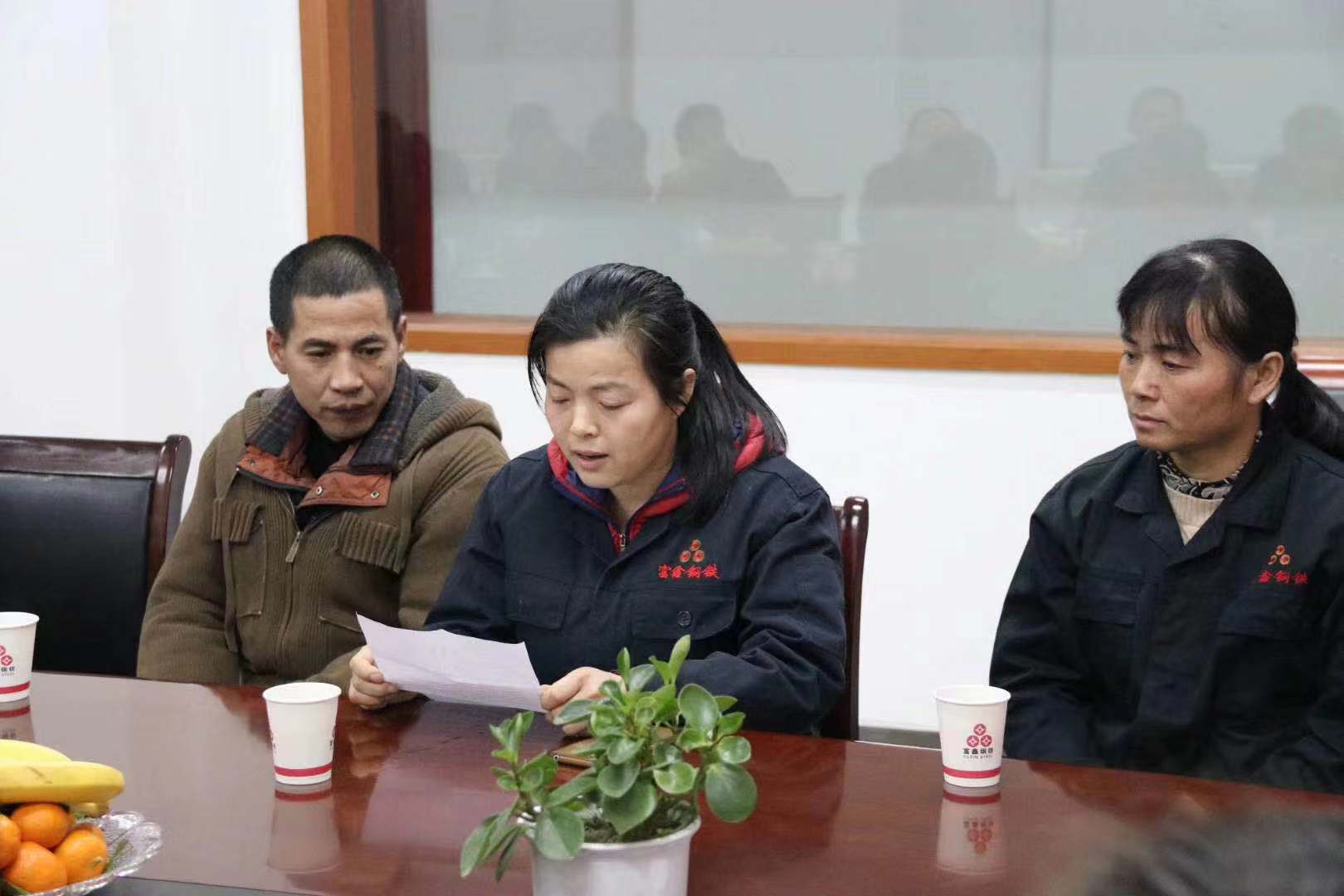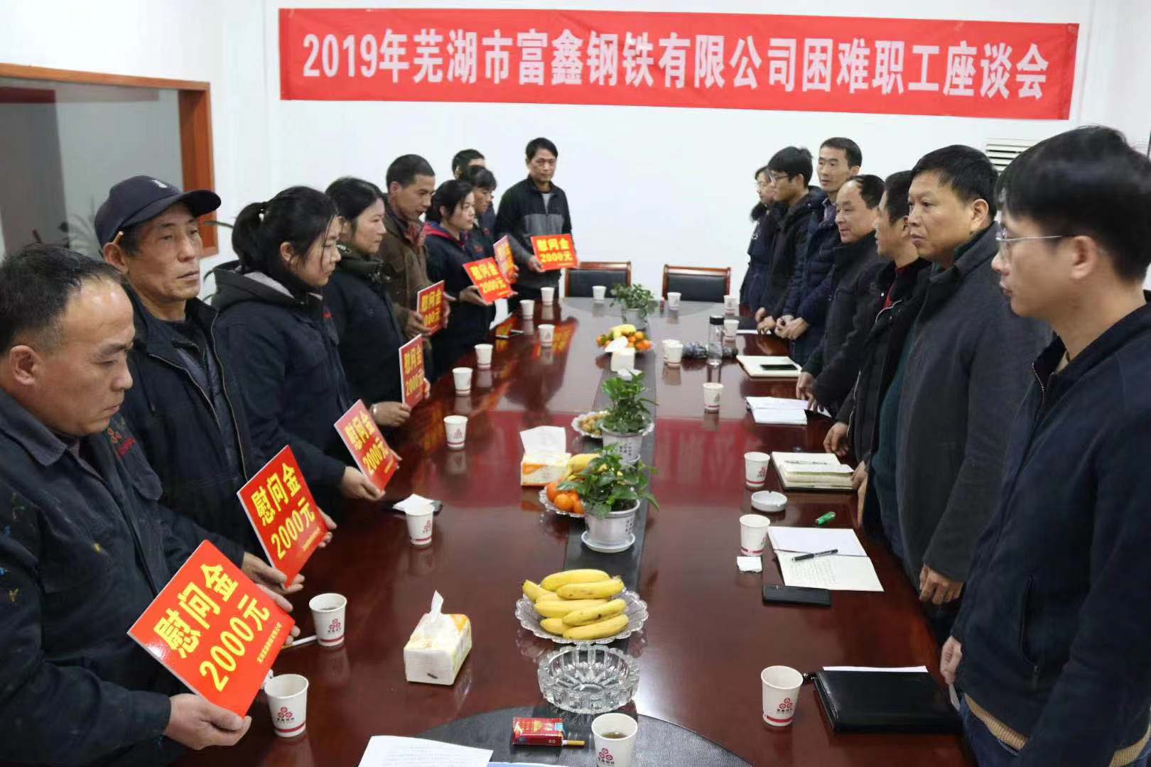 2020年春節(jié)將至,為讓困難職工度過一個(gè)溫暖祥和的春節(jié),1月7日上午,公司工會(huì)組織召開2019年度蕪湖市富鑫鋼鐵有限公司慰問困難職工座談會(huì)??h總工會(huì)黨組成員/副主席阮熙明、縣經(jīng)信局黨委委員/副局長(zhǎng)戴元根、縣經(jīng)信局黨委委員/系統(tǒng)工會(huì)主席郝建 、縣總工會(huì)法工部副部長(zhǎng)張陽、新港鎮(zhèn)總工會(huì)主席湯向東應(yīng)邀出席會(huì)議,公司10名困難職工代表參加會(huì)議。